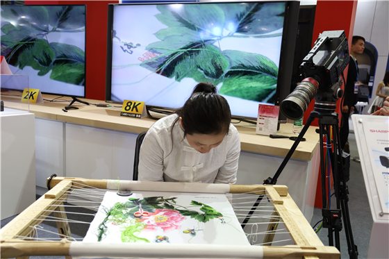 在現(xiàn)場,夏普直接以8C-B60A為我們演示了8K分辨率的刺繡表演現(xiàn)場直播。配合夏普的8K電視,細(xì)節(jié)纖毫畢現(xiàn),畫面解析力極其強(qiáng)悍。