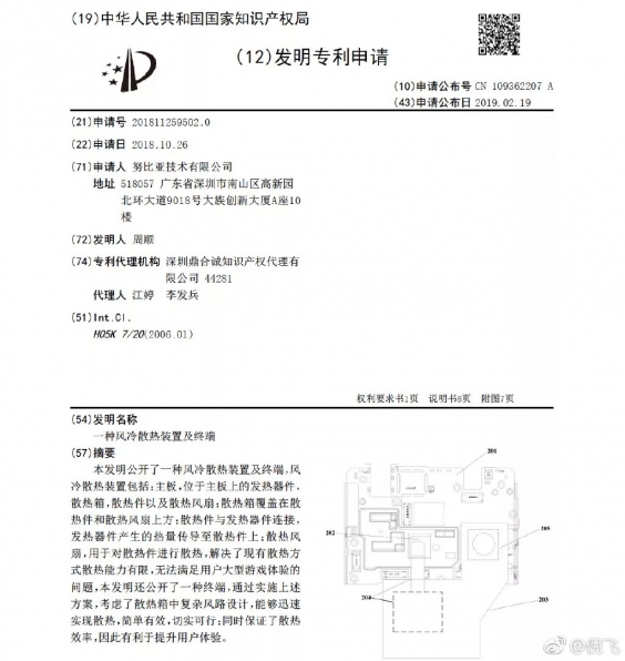 文件顯示,努比亞于2018年10月申請(qǐng)專利,2019年2月獲得專利。專利主要內(nèi)容是努比亞開發(fā)了一套復(fù)合式“風(fēng)冷x液冷”散熱模組,在極小的手機(jī)空間內(nèi)加入風(fēng)扇設(shè)計(jì),主動(dòng)針對(duì)熱源進(jìn)行干預(yù),迅速帶走熱量。