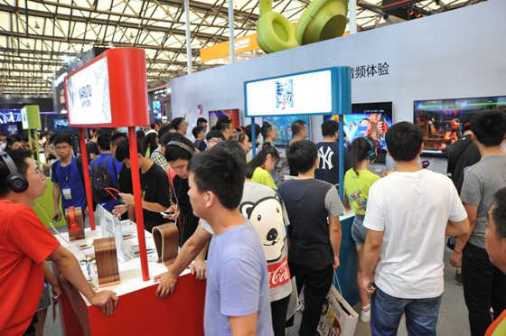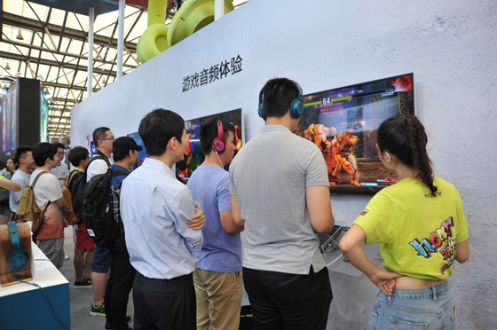 游戲音頻體驗(yàn)區(qū)引來(lái)了無(wú)數(shù)玩家一邊感受高品質(zhì)游戲音效,一邊大展身手。