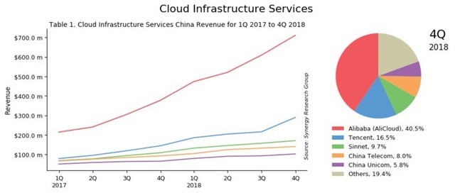 近日,美國市場調(diào)研機(jī)構(gòu)Synergy Research Group發(fā)布了2018年第四季度全球云基礎(chǔ)設(shè)施服務(wù)市場數(shù)據(jù),數(shù)據(jù)顯現(xiàn)阿里云以40.5%的占比排在中國市場份額第一。