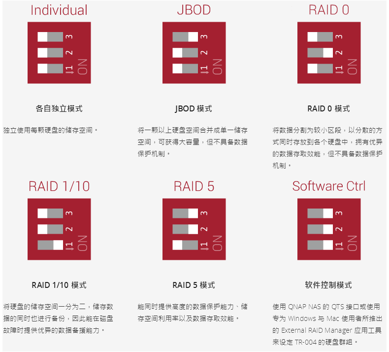 威聯通TR-004支持多種磁盤與數組配置,可以按照需求彈性規劃存儲空間。將模式切換開關的按鍵拔至相應位置,即可建立各自獨立模式、JBOD模式、RAID 0、RAID 1/10或RAID 5群組。除此之外,還可以啟用軟件控制功能,通過使用威聯通專門為Windows與Mac使用者所推出的應用工具來設定TR-004的硬盤群組。