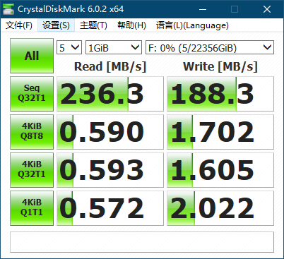 可以看到經過CrystalDiskMark測試其讀寫速度,我們默認隨機模式下讀取與寫入速度分別是236.3MB/s與188.3MB/s。