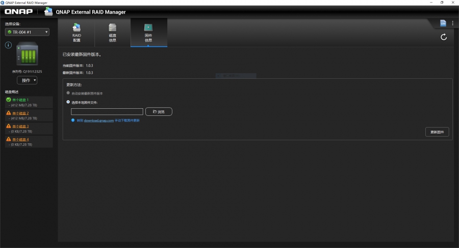 與大多同類產品不同的是,TR-004支持電腦端的軟件層面的控制,可以在威聯通官網中下載管理軟件QNAP External RAID Manager,接下來看一下這款軟件的操作流程。