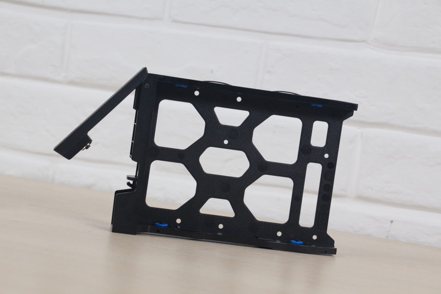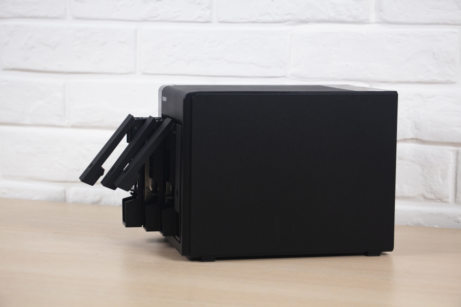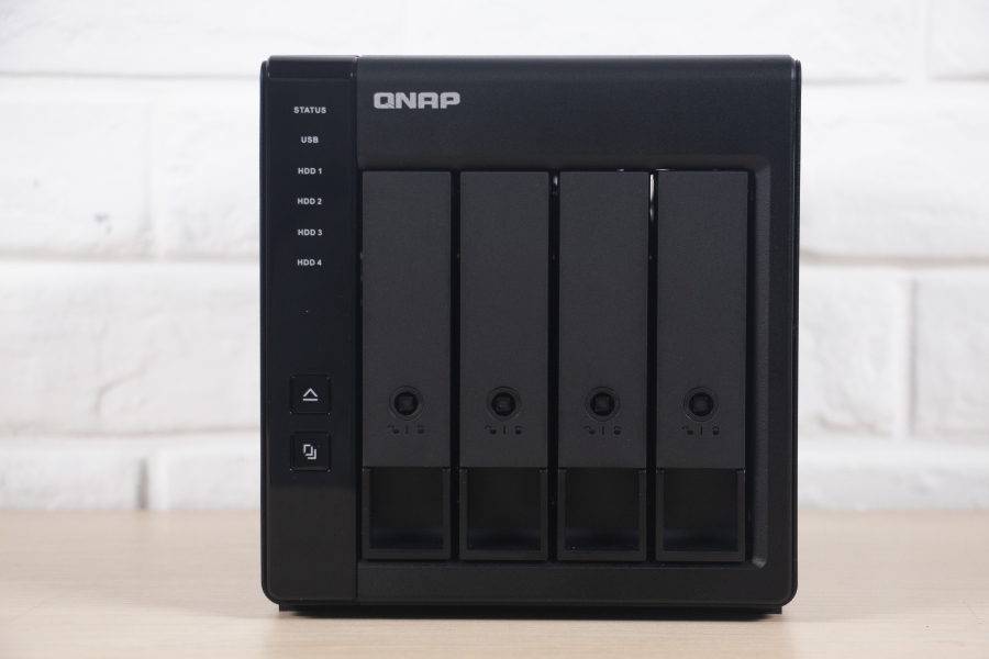 在外觀上威聯通TR-004依舊采用了傳統的家族式設計,黑色機身、線條分明,熟悉的臥式機身設計,整體外觀呈極簡大氣風格。在產品正面偏右位置依次排列四個硬盤托架,且四個托架均為可鎖式,可以有效防止插拔硬盤帶來的數據損壞。同時,四個硬盤托架也均為免螺絲安裝結構,在安裝硬盤時,只需拆開側邊條,裝入之后再合上側邊條即可,可以安裝3.5英寸的機械硬盤以及2.5英寸的機械或固態硬盤。