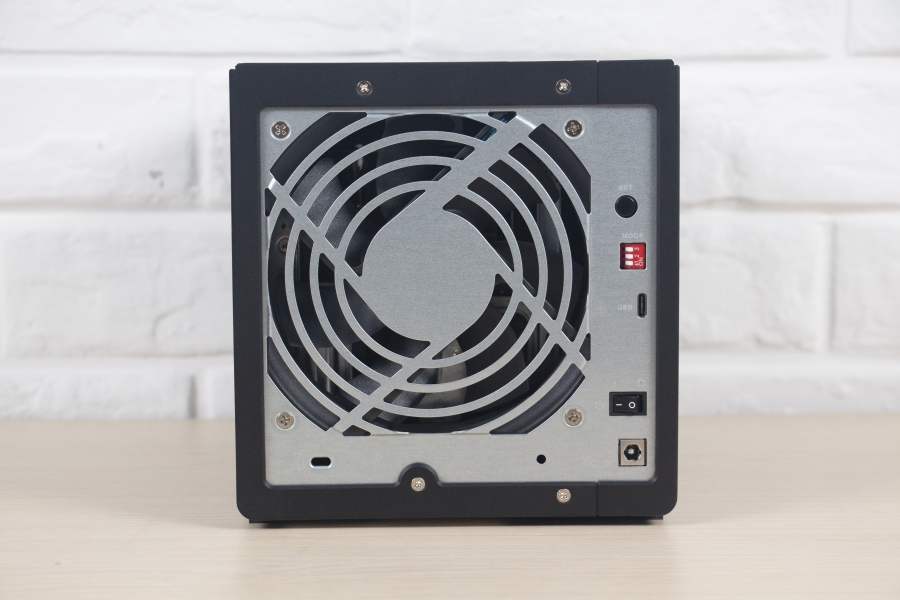 TR-004背部擁有一個12厘米的散熱風扇進風口,形成風冷散熱,可根據硬盤與系統溫度進行五級變速。風扇右側設計有電源開關鍵、硬盤模式確認鍵、RAID模式切換鍵、USB 3.0 Type-C接口以及一個電源接口。
