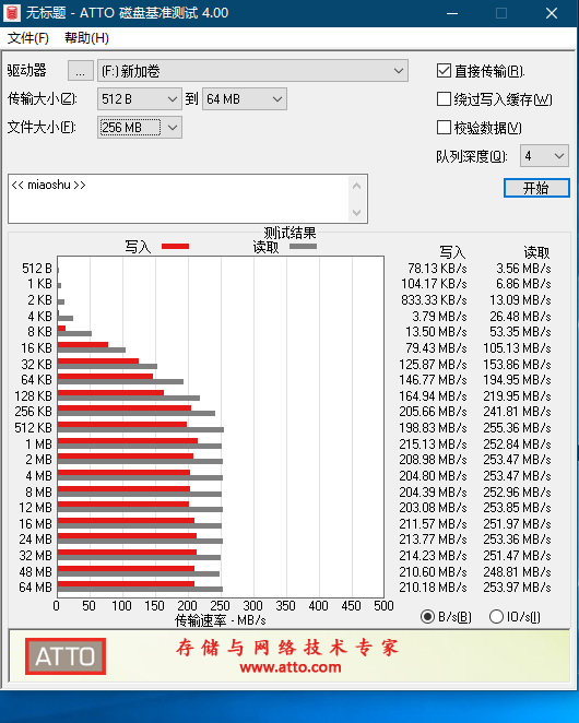 通過ATTO Disk Benchmark測出其最高讀取速度為255.36MB/s,最高寫入速度為215.13MB/s。