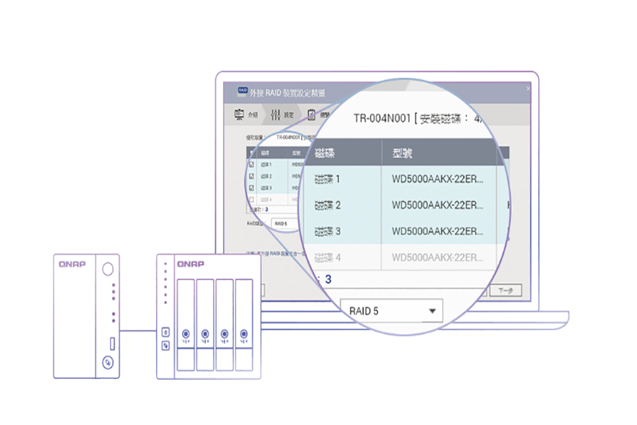 在TR-004已連接電腦的情況下,QNAP External RAID Manager會自動識別接入的TR-004。創建RAID群組時,QNAP External RAID Manager應用程序會根據插入的硬盤數量給出可執行的RAID模式。這里需要注意的是,構建RAID模式時,最好使用兩塊或多塊相同容量的硬盤,如果容量不一樣,在構建RAID模式時,可能會出現只識別最小容量硬盤的情況。