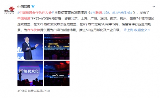 4月23日,中國聯通董事長王曉初在5G創新發展峰會上宣布,中國聯通即將在北京、上海、廣州、深圳、南京、杭州、雄安等7個城市開通5G試驗網,同時在33座城市的熱點區域和n座城市行業應用區提供5G網絡覆蓋,其中上海是作為中國首個5G試商用的城市。