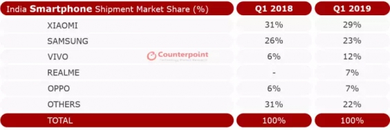 其中,小米以29%的市場份額占據榜首,同比下降2%。三星排在第二位,雖然三星在中國市場不景氣,但是在印度市場還是十分受歡迎的,市場份額達到了23%。而第三名則是vivo,市場份額為12%,同比增長6%。隨后的就是realme和OPPO,各占據了7%的市場份額。