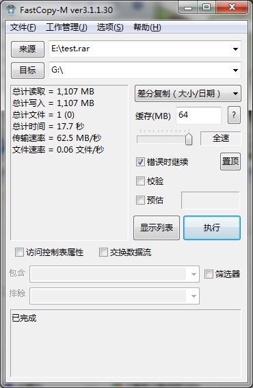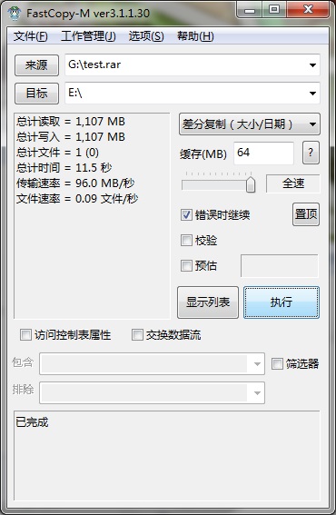FASTCopy測試讀取速度為96MB/s,寫入速度為62.5MB/s