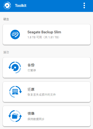我們可以在希捷官網下載這款軟件來對硬盤進行安全設置,Toolkit備份軟件為銘系列提供有備份、還原和鏡像三個功能。其中還原功能,可以在誤刪或數據丟失后對其進行找回,當然前提是對缺失文件有過備份處理。而鏡像功能則是將硬盤文件實時同步到本地設備中,當硬盤不在身邊的時候也能滿足你對現有文件的調用需求。