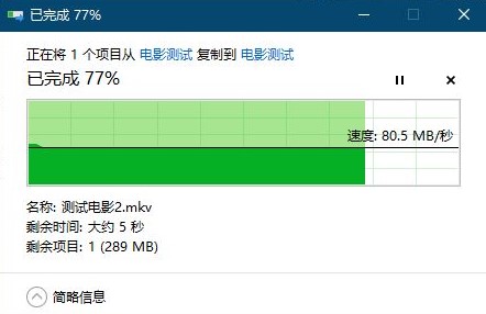 在實際傳輸文件時,銘系列也基本達到了同樣的傳輸速度,平均值在80MB/s左右,一部1.5GB左右的高清視頻,10秒鐘左右即可傳輸完成。